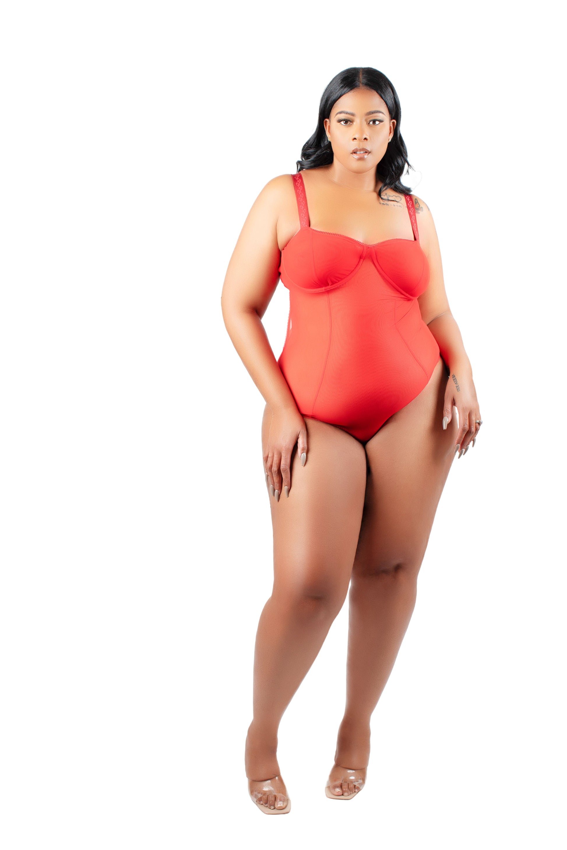 Mesh Teddy with wide shoulder straps; hook and eye back closure, bra cups