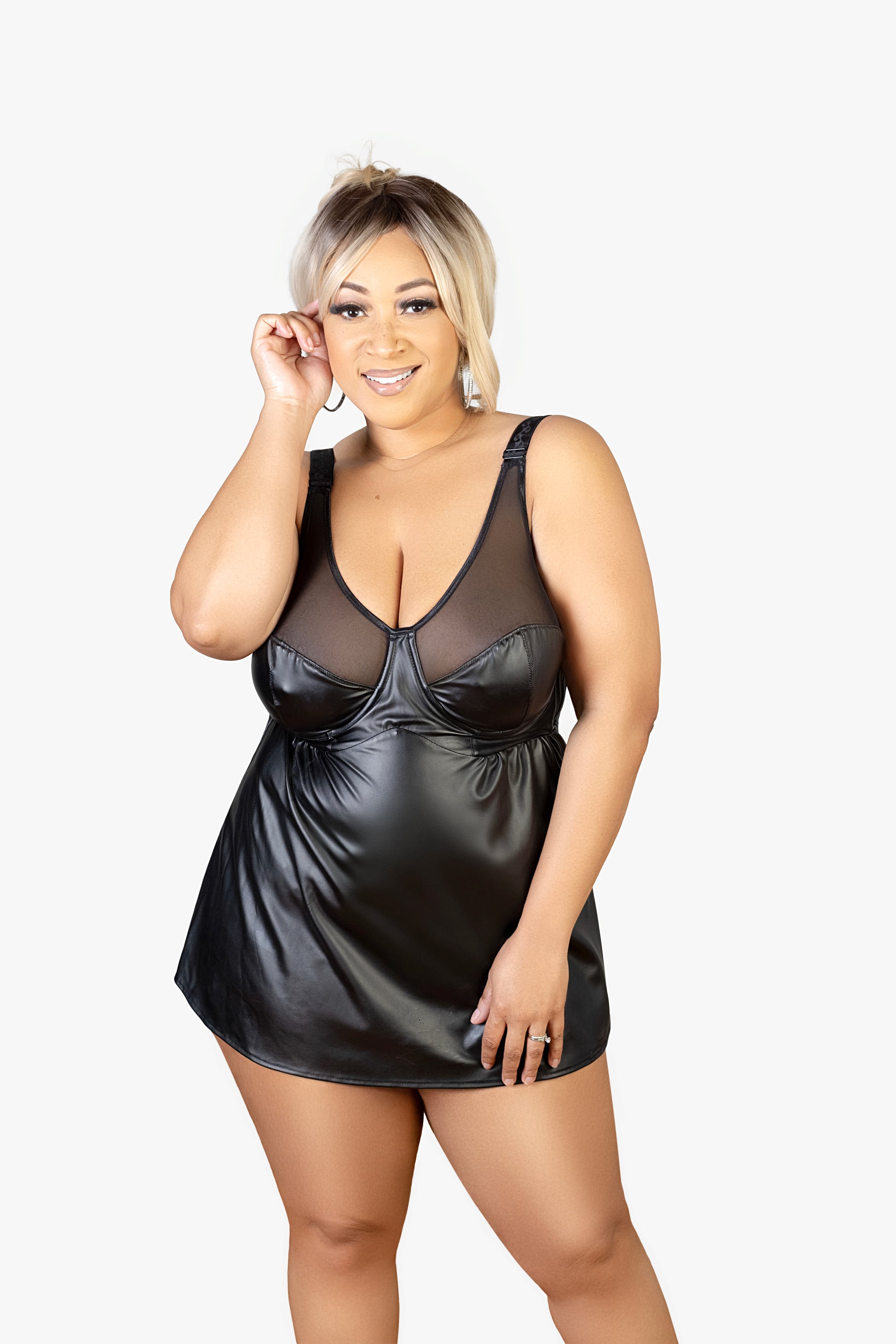 Mesh faux leather cups with hook and eye, wide shoulder straps for support.