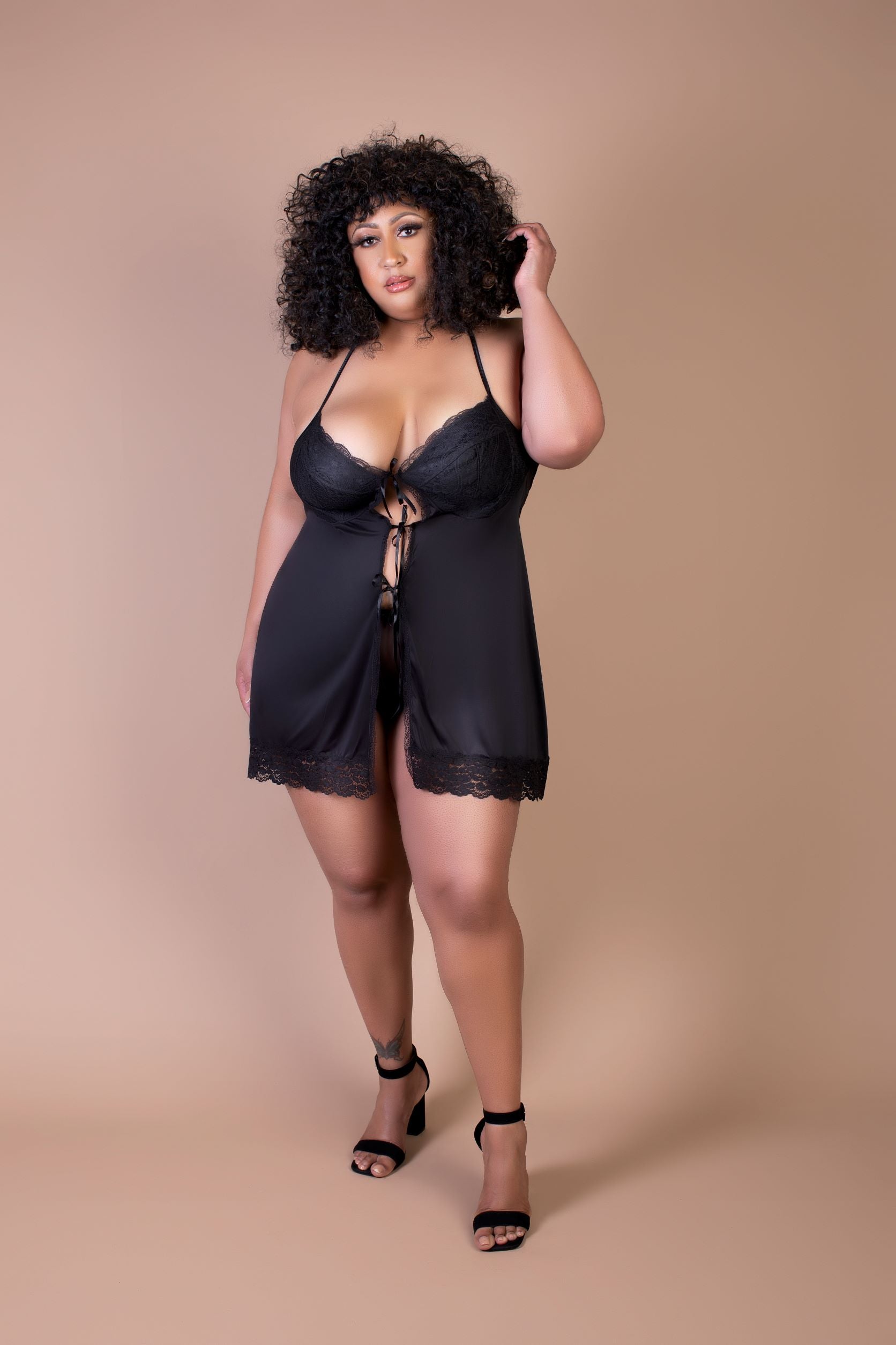 Soft fabric trimmed with lace with inserted cups for support. Model is wearing 3X