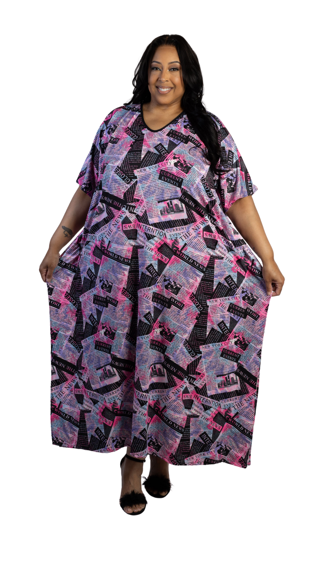 This sophisticated maxi kaftan features an authentic newspaper print design that creates a chic, editorial-inspired aesthetic. The print showcases realistic newspaper layouts with headlines, columns of text, and various typographic elements rendered in classic black ink on white newsprint background, with striking pink and purple accent highlights that add a contemporary fashion twist.